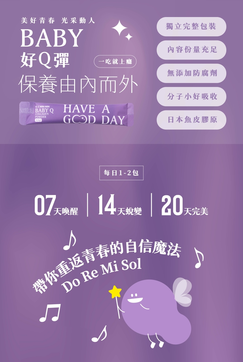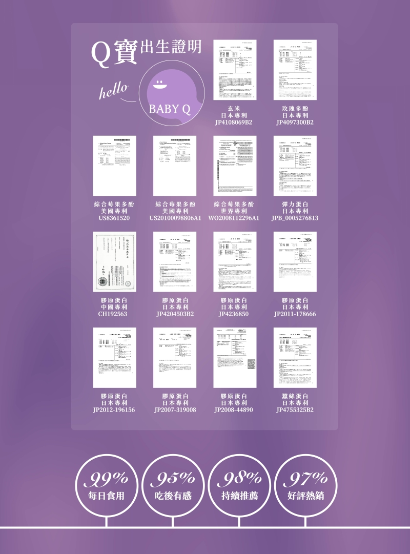 成分:膠原蛋白、葡萄糖、百香果果汁粉(砂糖、麥芽糊精、百香果汁、檸檬酸、檸檬酸鈉、香料、β-胡蘿蔔素)、蘋果酸、綜合莓果萃取物(葡萄、野生藍莓、覆盆子、蔓越莓、西梅、櫻桃、山桑子、草莓、二氧化矽)、彈力蛋白、玄米萃取物、蠶絲蛋白、玫瑰花瓣萃取物、酸櫻桃萃取物(阿拉伯膠、酸櫻桃)。