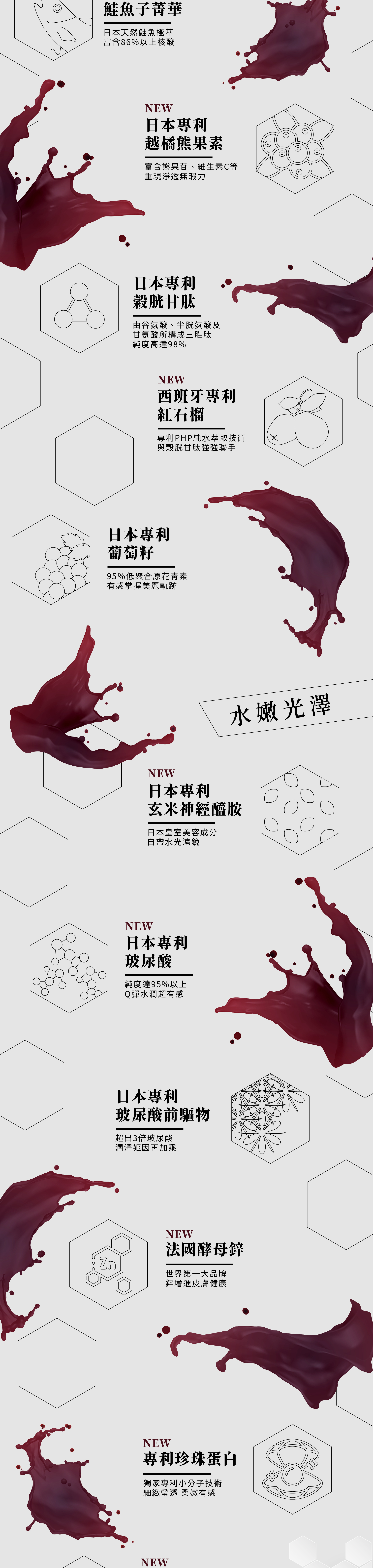 成分:水、葡萄果汁粉(葡萄濃縮汁、麥芽糊精、玉米來源可溶性纖維、菊苣纖維、果寡醣、DL-蘋果酸、阿拉伯膠、檸檬酸、香料、海藻糖葡萄皮萃取)、鮭魚精巢萃取物、N-乙醯葡萄糖胺(糊精、水解幾丁質)、流行鏈球菌發酵物(含透明質酸鈉)、穀胱甘肽、葡萄籽萃取物、葡萄籽萃取物、鋅酵母、石榴萃取物、越橘萃取物(越橘萃取物、糊精)、玄米萃取物、酵母粉(酵母粉、玉米澱粉)、(含β-菸醯胺單核苷酸(β-NMN))、珍珠粉、蔗糖素(甜味劑)