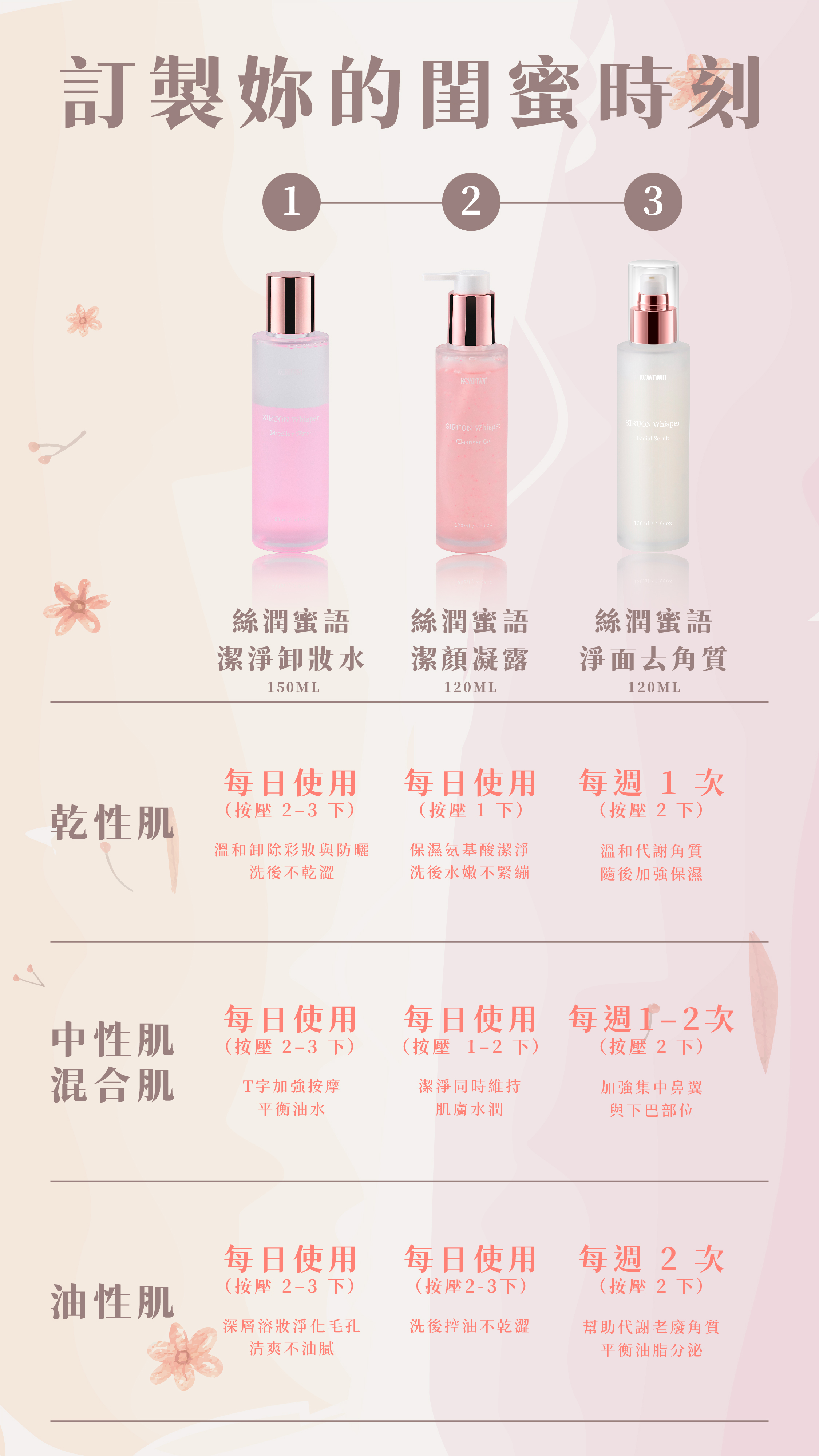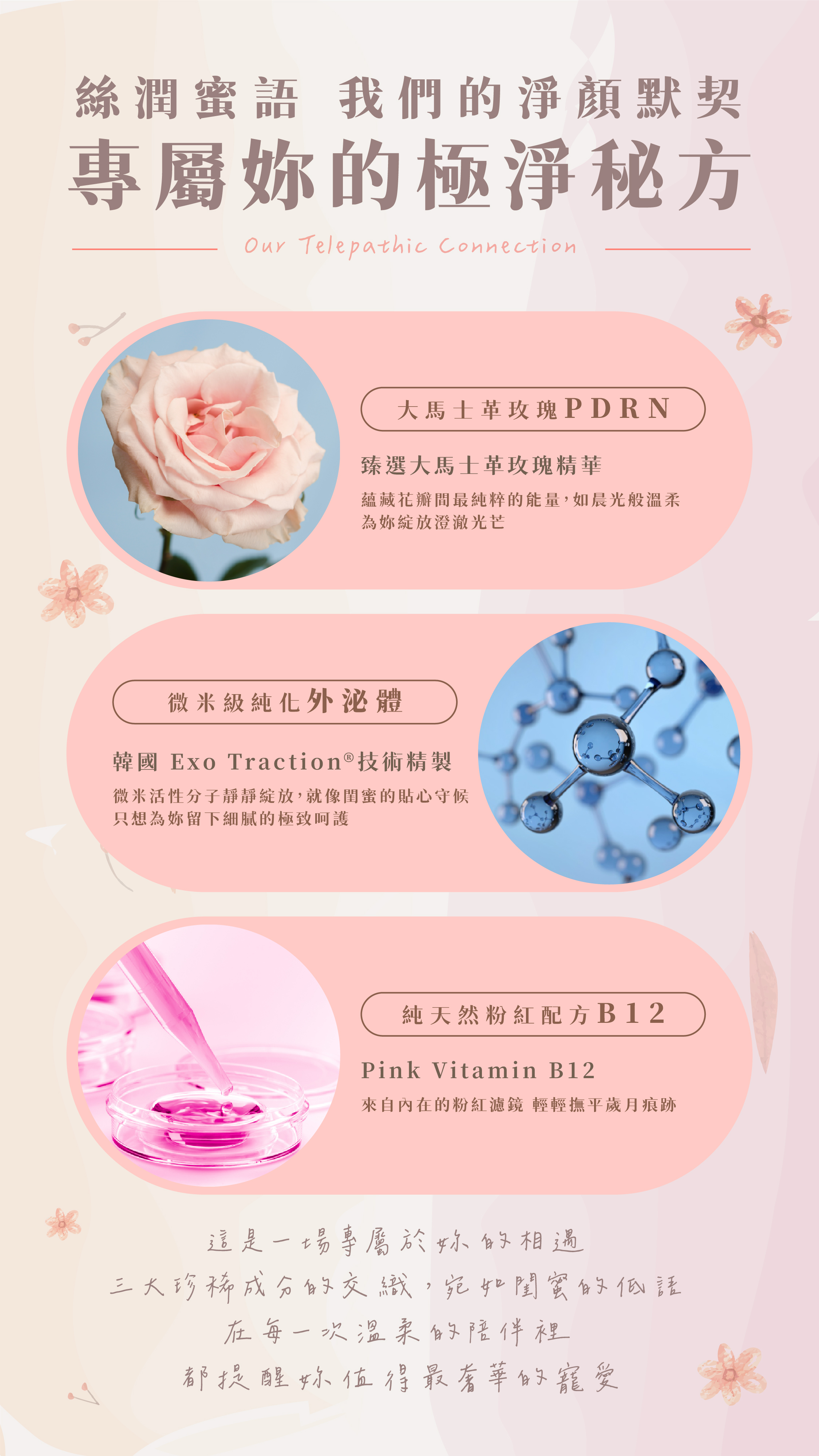 主要成分:山茶花植物囊泡、玫瑰PDRN、牛奶外泌體、馬魯拉油、辣木籽油、夏威夷堅果油、玫瑰果油、海洋深層水、褐藻多醣體